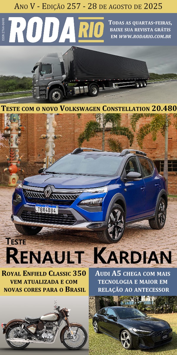 A edição de RodaRio tem como Destaque um teste e apresentação do SUV compacto Renault Kardian 2026, com a nova versão “top” Iconic e importantes novidades em toda a linha do carro produzido no Paraná. O Panorama tem a chegada ao Brasil do novo Audi A5 na versão sedã, com avaliação e primeiras impressões ao volante. O CarNews antecipa os Peugeot 208 e 2008, que serão os próximos modelos a contar com a tecnologia Bio-Hybrid da Stellantis. O TranspoNews apresenta um teste com o caminhão Volkswagen Constellation 20.480 com descida ao litoral e subida de volta à capital paulista. E o MotoNews traz as atualizações e as novas cores da Royal Enfield Classic 350, que desembarca no mercado brasileiro. A edição tem ainda as notas temáticas de CarMais, TranspoMais e MotoMais e a editoria Rio, com os destaques automotivos cariocas e fluminenses na coluna Espaço Motor Rio, do jornalista João Mendes.