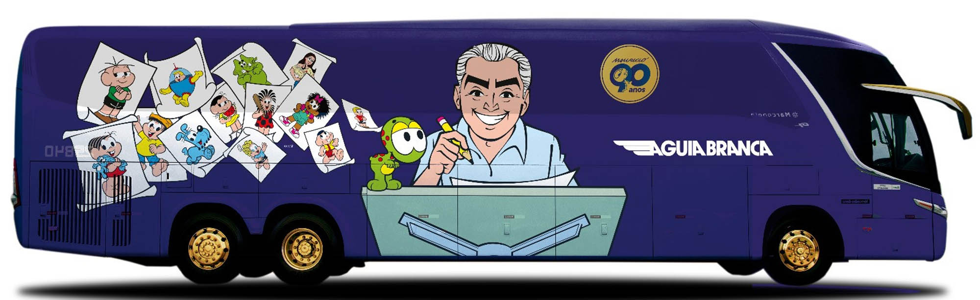 A Viação Águia Branca, empresa de transporte rodoviário de passageiros do Grupo Águia Branca, lançou seu terceiro ônibus temático, desta vez, em parceria com o MSP Estúdios. O veículo faz homenagem aos 90 anos de Mauricio de Sousa, criador da “Turma da Mônica”, celebrando sua genialidade e o impacto de sua obra na cultura brasileira. O veículo, modelo RSD, combina o conforto de um serviço semi-leito com a tecnologia do chassi Mercedes-Benz O 500 RSD, sendo uma opção para viagens de média e longa distâncias, com 42 lugares e acessibilidade completa. De um lado do ônibus, há a imagem de Mauricio de Souza jovem, em seus primeiros desenhos, do outro, o artista maduro, acompanhados de seus personagens mais icônicos. No interior, os passageiros encontram um painel afetivo com figuras marcantes como Mônica, Cebolinha, Horácio, Bidu, Louco, Cientista, Milena e Franjinha. A viagem inaugural ocorreu no domingo dia 26, com saída do Terminal Barra Funda (SP) e destino ao Rio de Janeiro (RJ). Os passageiros receberam um kitespecial de lançamento, com brindes da “Turma da Mônica”, um “paper toy” exclusivo do novo ônibus e um folheto informativo destacando o novo ponto de embarque da Viação Águia Branca na capital paulista, que passa a funcionar no Shopping Metrô Itaquera a partir de 31 de outubro.