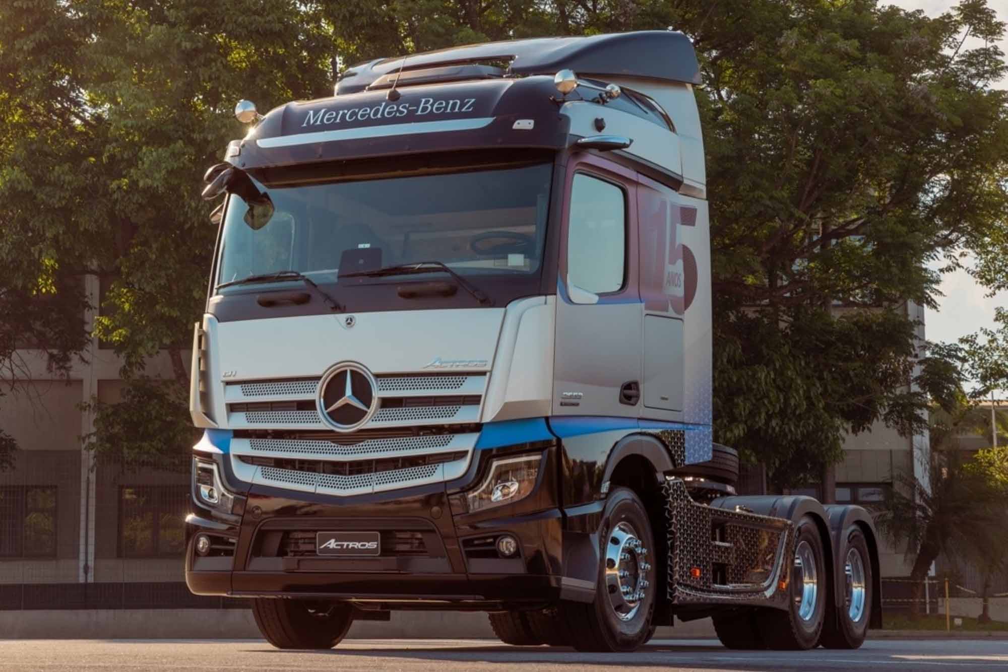 A Mercedes-Benz decidiu celebrar em grande estilo os 15 anos de lançamento do Actros rodoviário no Brasil. Para isso, lançou o Actros Evolution Série Especial 15 Anos, edição limitada e exclusiva de 15 unidades que exaltam uma trajetória de inovação, tecnologia, conforto, eficiência e segurança nas estradas brasileiras. Já disponíveis para comercialização, os 15 cavalos-mecânicos têm design exclusivo, na cor Cinza Morsa, com adesivagem especial alusiva à “Série 15 anos” e identificação do nome “Mercedes-Benz” na testeira da cabine. São dez unidades do Actros Evolution 2553 LS 6×2 e cinco do Actros Evolution 2653 S 6×4. Os caminhões são equipados com o motor OM 471 de última geração, com 530 cavalos de potência, o mais forte da marca no Brasil, com uma configuração específica.